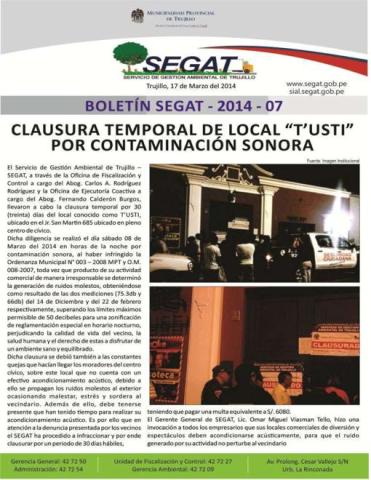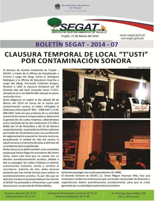 En este boletín se informa sobre las actividades realizadas por el Servicio de Gestión Ambiental de Trujillo en la última semana de febrero y primera semana de marzo del 2014 como: Multa a local "BABYLON" por contaminación sonora, Conferencia: Impacto del Mercurio sobre la salud humana y el ambiente en La Libertad, entrega de certificados del Taller Mini Jardín y Terrarios y participación en la Conmemoración del 479 Aniversario de la Fundación de Trujillo.