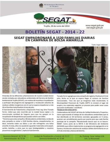 En este boletín se informa sobre las actividades realizadas por el Servicio de Gestión Ambiental de Trujillo del 23 de Junio al 29 de Junio del 2014 como: Se empadronarà a 1520 familias diarias en campaña de bolsas amarilla, campaña de limpieza y desarenado en Urb. Covicorti, limpieza y baldeo en Plaza Mayor de Trujillo y Campaña para invocar a la poblaciòn e instituciones pùblicas y privadas a pintar fachadas por fiestas patrias.