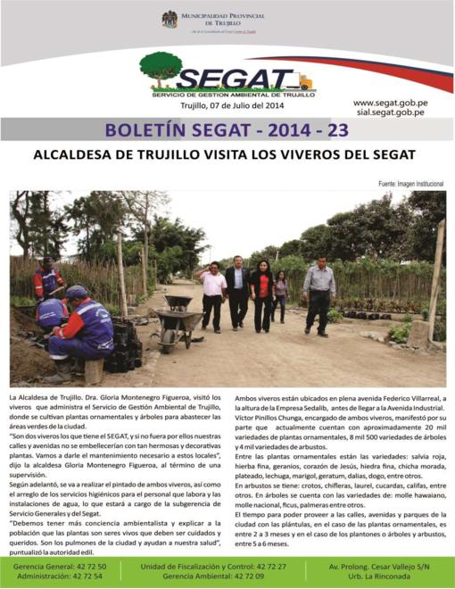 En este boletín se informa sobre las actividades realizadas por el Servicio de Gestión Ambiental de Trujillo del 30 de Junio al 06 de Julio del 2014 como: Inspección a los viveros del SEGAT por la alcaldesa de Trujillo, erradicación de 20 toneladas de basura y desmonte de las urbanizaciones Los Granados y Gran Chimú y Campaña de desarenado en el Ovalo La Marina
