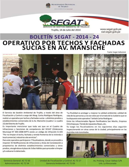 En este boletín se informa sobre las actividades realizadas por el Servicio de Gestión Ambiental de Trujillo del 07 de Julio al 14 de Julio del 2014 como: Operativo por techos y fachadas sucias en Av. Mansiche, Campaña de baldeo en tres urbanizaciones de la ciudad, resembrado de gras en av. América Norte (exteriores del cuartel) y apertura de servicio en Urb. Sol y Luz..