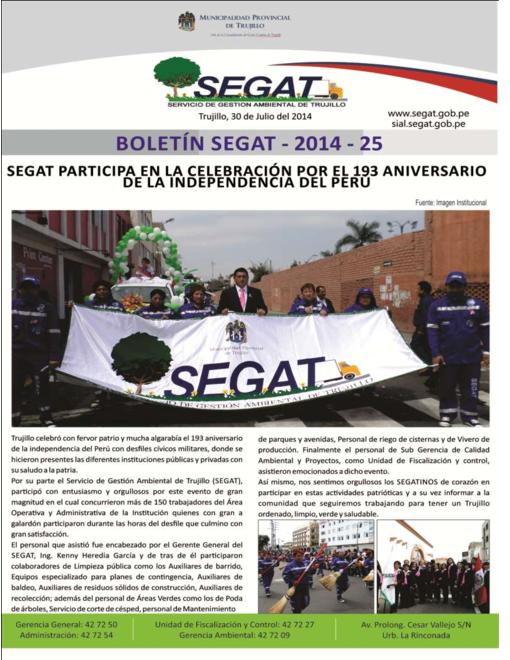 En este boletín se informa sobre las actividades realizadas por el Servicio de Gestión Ambiental de Trujillo del 14 de Julio al 29 de Julio del 2014 como: Participación en la celebración por el 193 Aniversario de la Independencia del Perú, limpieza en mercado La Hermelinda y operativo de ruidos molestos por Fiestas Patrias (viernes 25, sábado 26 y domingo 27).