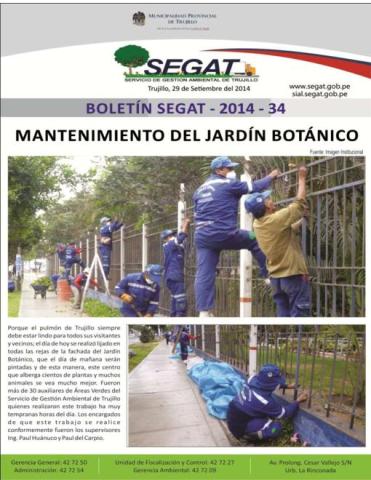 En este boletín se informa sobre las actividades realizadas por el Servicio de Gestión Ambiental de Trujillo del 22 de Setiembre al 28 de Setiembre del 2014 como: Mantenimiento del Jardín Botánico, desarenado en la Av. Juan Pablo II y Olimpiadas internas 2014.