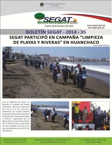 En este boletín se informa sobre las actividades realizadas por el Servicio de Gestión Ambiental de Trujillo del 29 de Setiembre al 05 de Octubre del 2014 como: Limpieza de playas y riveras en Huanchaco, SEGAT y SCOUTS TRUJILLO en alianza para sembrar vida y reconocimiento a los mejores colaboradores del mes de setiembre.