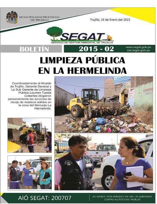 En este boletín se informa sobre las actividades realizadas por el Servicio de Gestión Ambiental de Trujillo del 12 al 18 de Enero del 2015 como: Limpieza Pública en La Hermelinda, reunión de coordinación entre supervisores de la Sub Gerencia de Limpieza Pública y Gerencia General del SEGAT, empresa dona llantas al SEGAT, trabajo de la Sub Gerencia de Áreas Verdes en la Urb. Primavera y limpieza de Centro Histórico de Trujillo, turno noche.