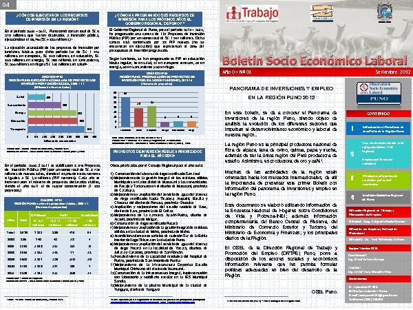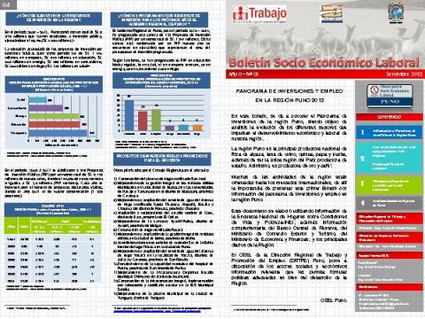 En este boletín, se da a conocer el Panorama de inversiones de la región Puno, siendo objeto de análisis la evolución de los diferentes sectores que impulsan el desenvolvimiento económico y laboral de nuestra región.