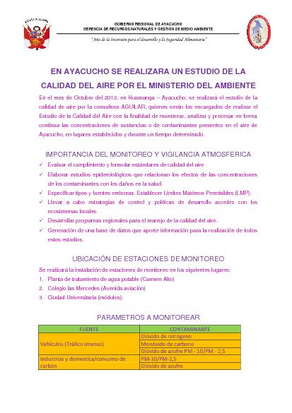 En el mes de Octubre del 2013, en Huamanga Ayacucho, se realizará el estudio de la calidad de aire por la consultora AGUILAR