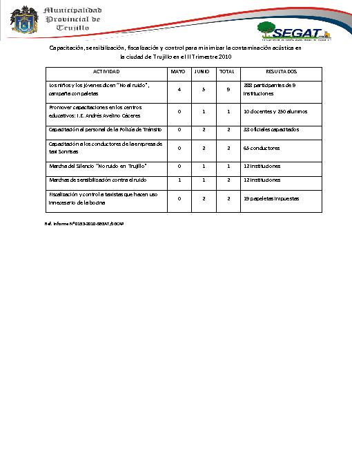 Capacitación, sensibilización, fiscalización y control para minimizar la contaminación acústica en la ciudad de Trujillo en el II Trimestre 2010