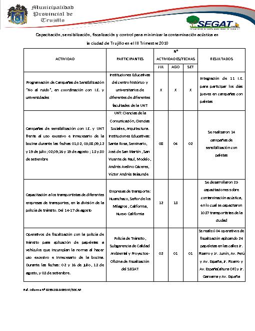 Capacitación, sensibilización, fiscalización y control para minimizar la contaminación acústica en la ciudad de Trujillo en el III Trimestre 2010