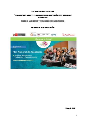 CICLO DE SESIONES VIRTUALES “DIALOGUEMOS SOBRE EL PLAN NACIONAL DE ADAPTACIÓN CON GOBIERNOS REGIONALES” SESIÓN 4: MONITOREO Y EVALUACIÓN Y FINANCIAMIENTO INFORME DE SISTEMATIZACIÓN