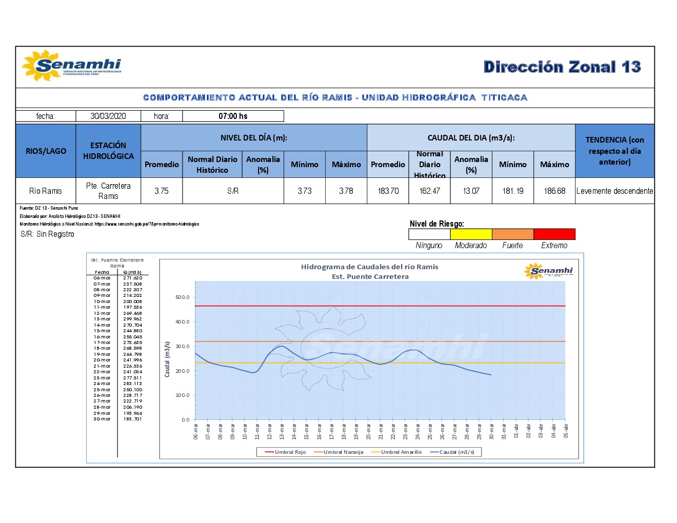 COMPORTAMIENTO ACTUAL DEL RÍO RAMIS - UNIDAD HIDROGRÁFICA TITICACA 30/03/2020
