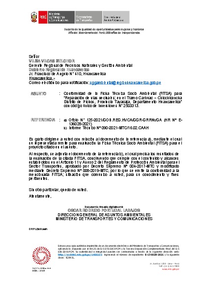 Conformidad a la Ficha Técnica Socio Ambiental – FITSA para el proyecto “Reparación de vías vecinales; en el Tramo Carhuac – Chicchicancha Distrito de Pichos, Provincia Tayacaja, Departamento Huancavelica” con código único de inversiones N° 2503313.