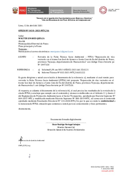 Conformidad a la Ficha Técnica Socio Ambiental – FITSA “Reparación de vías vecinales en el tramo San José de Aymara a Santa Cruz de Ila del distrito de Pazos, provincia Tayacaja, departamento de Huancavelica” con Código Único Invierte pe Nº 2497328.