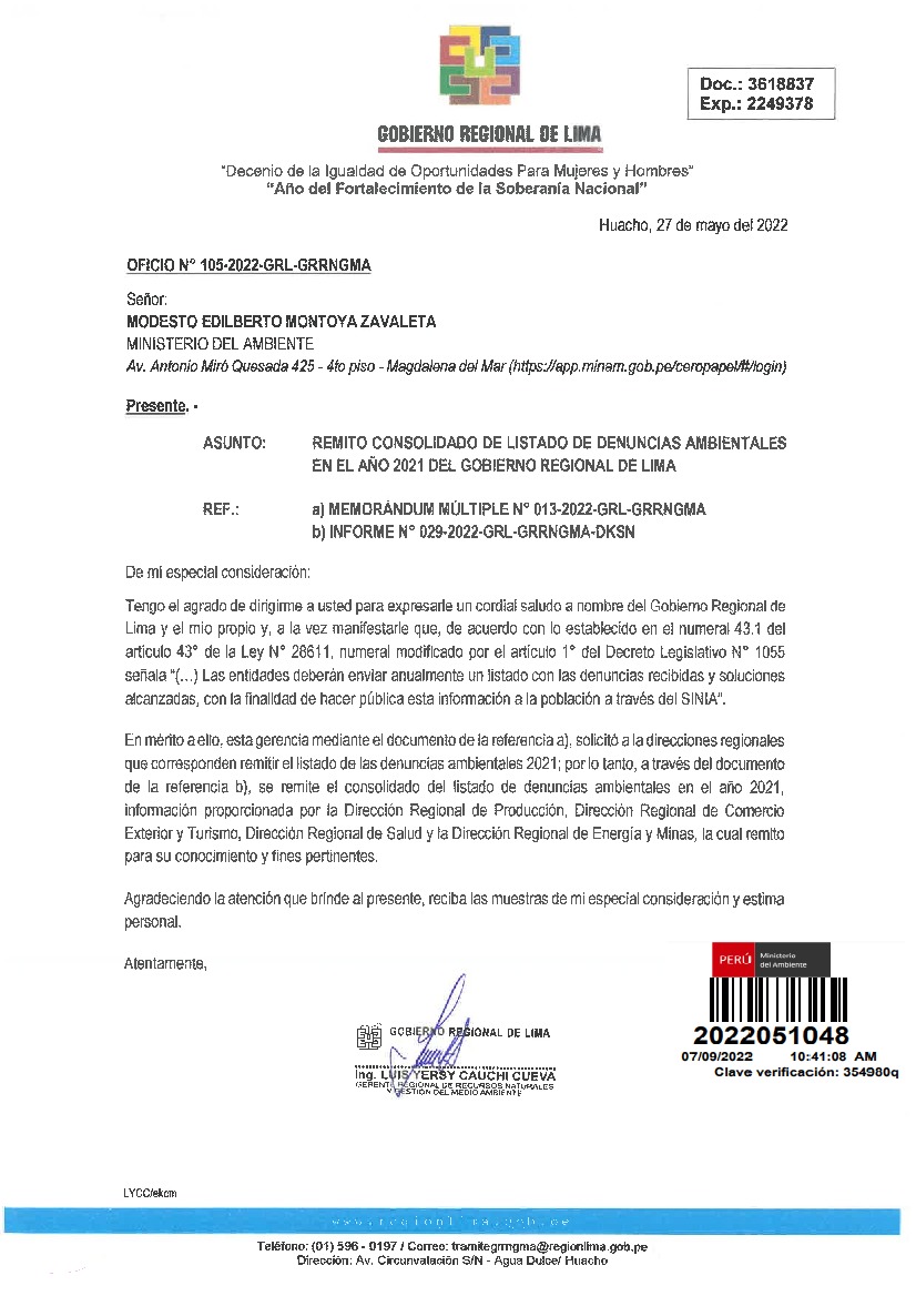 La entidad remite al Ministerio del Ambiente información sobre las denuncias ambientales en cumplimiento de lo establecido en el Decreto Legislativo N° 1055 que modifica el artículo 43° de la Ley N° 28611, que indica que "Las entidades deberán enviar anualmente un listado con las denuncias recibidas y soluciones alcanzadas, con la finalidad de hacer pública esta información a la población a través del SINIA".