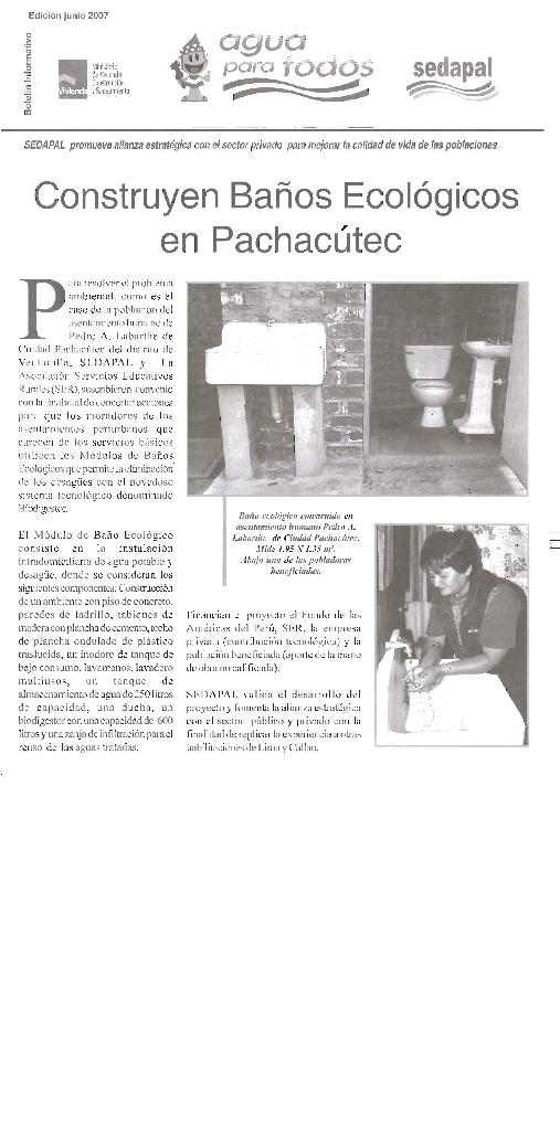 El módulo de baño ecológico consiste en la instalación intradomiciliaria de agua potable y desagüe, donde se consideran los siguientes componentes: Construcción de un ambiente con piso de concreto, paredes de ladrillo, tabiques de madera con plancha de cemento, techo de plancha ondulado de plástico traslucida, un inodoro de tanque de bajo consumo, lavamanos, lavedero multiuso, un tanque de almacenamiento de agua de 250 litros de capacidad, una ducha, un biodigestor con una capacidad de 600 litros y una zanja de infiltración para el reuso de las aguas tratadas