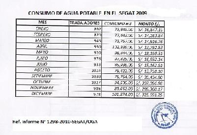 Este documento informa el consumo de agua potable en el SEGAT por mes en el 2009. A través del D.S. N°009-2009-MINAM, se establece que las empresas del sector público cumplan medidas de ecoeficiencia tales como el ahorro en consumo de energía, agua y papel, así como en los gastos de combustible en sus vehículos.