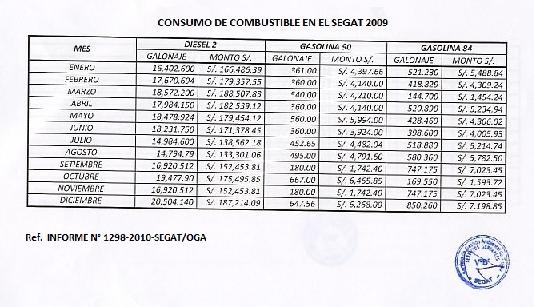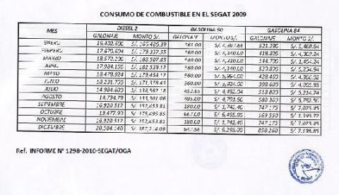 Este documento informa el consumo de combustible en el SEGAT por mes en el 2009. A través del D.S. N°009-2009-MINAM, se establece que las empresas del sector público cumplan medidas de ecoeficiencia tales como el ahorro en consumo de energía, agua y papel, así como en los gastos de combustible en sus vehículos.