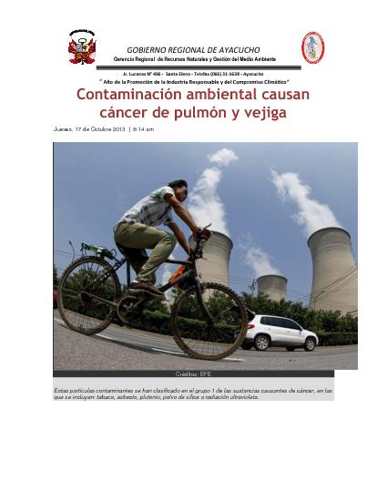 La Agencia Internacional para la Investigación del Cáncer (IARC, en inglés) anunció que ha incluido la contaminación ambiental como uno de los elementos que causan cáncer en humanos, con especial incidencia en el caso del de pulmón aunque también en el de vejiga