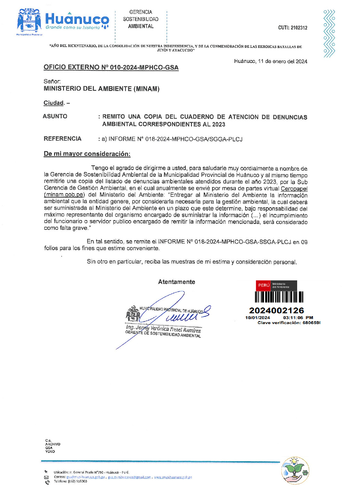 La entidad remite al Ministerio del Ambiente información sobre las denuncias ambientales en cumplimiento de lo establecido en el Decreto Legislativo N° 1055 que modifica el artículo 43° de la Ley N° 28611, que indica que "Las entidades deberán enviar anualmente un listado con las denuncias recibidas y soluciones alcanzadas, con la finalidad de hacer pública esta información a la
