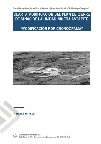 CUARTA MODIFICACIÓN DEL PLAN DE CIERRE DE MINAS DE LA UNIDAD MINERA ANTAPITE “MODIFICACIÓN POR CRONOGRAMA”