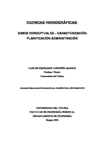 El documento se compone de once capítulos, a lo largo de los cuales se hace una reseña de la diversidad étnica, biológica y climática de Colombia; se exponen los problemas que se han originado por la relación equivocada del ser humano con la naturaleza; se compilan algunos conceptos sobre cuenca hidrográfica y manejo de cuencas; se hace una reseña histórica de lo que ha sido el desarrollo del manejo de cuencas, a nivel mundial y nacional; se analizan las interrelaciones que se pueden presentar entre los diferentes elementos que se encuentran en una cuenca hidrográfica, enfatizando en las relaciones que se dan entre las plantas, el suelo y el agua; se expone la forma como las alteraciones ambientales surgen de la interacción entre los procesos naturales, sociales, económicos y culturales, y la afectación que estas alteraciones pueden traer a nivel local, regional o global; para finalizar con temas relacionados con el proceso de planificación de cuencas hidrográficas, y la legislación que, sobre el particular, se tiene en Colombia.