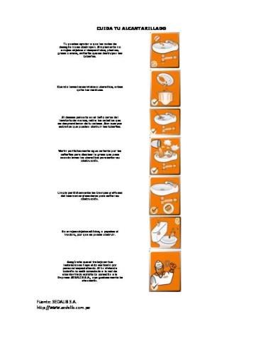 Este documento Sedalib S.A. da las recomendaciones con el fin de cuidar el agua. Se denomina alcantarillado al sistema de estructuras y tuberías usado para la recogida y transporte de las aguas residuales y pluviales de una población desde el lugar en que se generan hasta el sitio en que se vierten al medio natural o se tratan.