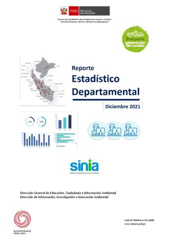 Los reportes estadísticos ambientales departamentales (Dossiers) son documentos de síntesis que contienen datos generales, así como la información estadística más importante sobre la presencia del sector ambiente en los departamentos del Perú, con la finalidad de servir como una herramienta que brinda información de calidad, oportuna y clara sobre el estado del ambiente y los recursos naturales con la finalidad que puedan ser utilizados en los procesos de gestión ambiental y alertar sobre posibles problemas ambientales.
