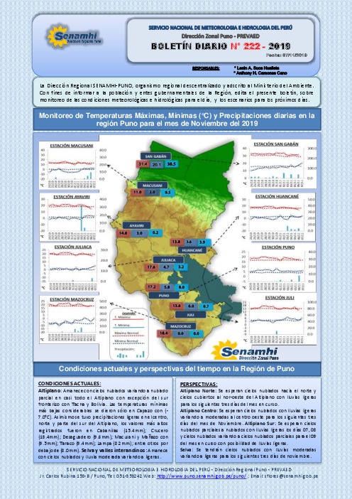 La Dirección Regional SENAMHI-PUNO, organismo regional descentralizado y adscrito al Ministerio del Ambiente. Con fines de informar a la población y entes gubernamentales de la Región, edita el presente boletín, sobre monitoreo de las condiciones meteorológicas e hidrológicas para el día, y los escenarios para los próximos días.