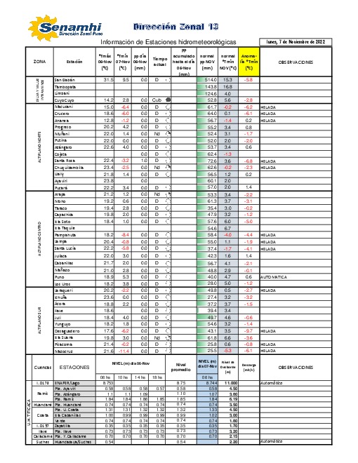 Datos hidrometeorológicos de la DZ13 – Puno del 07/11/2022