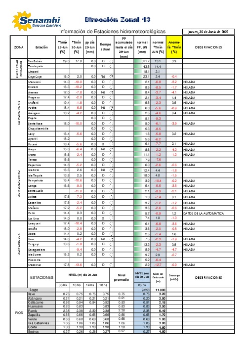 Datos hidrometeorológicos de la DZ13 – Puno del 30/06/2022