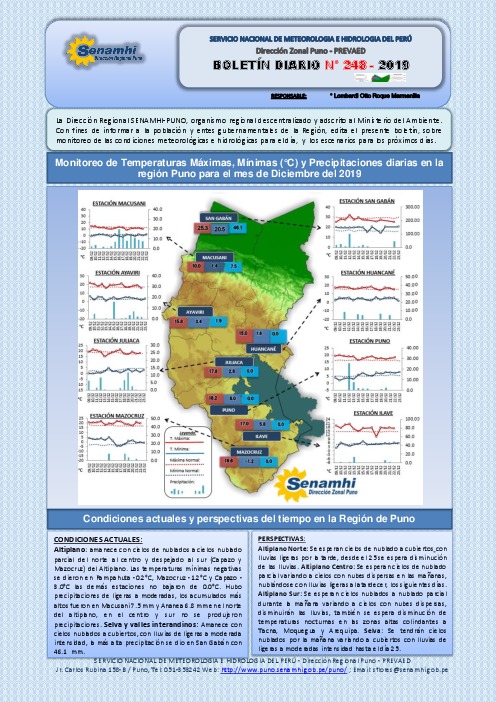 La Dirección Regional SENAMHI-PUNO, organismo regional descentralizado y adscrito al Ministerio del Ambiente. Con fines de informar a la población y entes gubernamentales de la Región, edita el presente boletín, sobre monitoreo de las condiciones meteorológicas e hidrológicas para el día, y los escenarios para los próximos días.