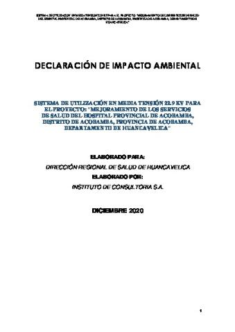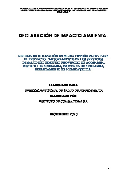 DECLARACIÓN DE IMPACTO AMBIENTAL (DIA) SISTEMA DE UTILIZACIÓN EN MEDIA TENSIÓN 22.9 KV PARA EL PROYECTO: “MEJORAMIENTO DE LOS SERVICIOS DE SALUD DEL HOSPITAL PROVINCIAL DE ACOBAMBA, DISTRITO DE ACOBAMBA, PROVINCIA DE ACOBAMBA, DEPARTAMENTO DE HUANCAVELICA”