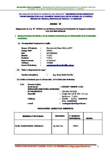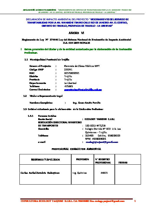 Declaración de Impacto Ambiental: Mejoramiento del Servicio de Transitabilidad por la Av. Mansiche, tramo Río de Janeiro – Av. El Cortijo, Distrito de Trujillo, Provincia de Trujillo – La Libertad