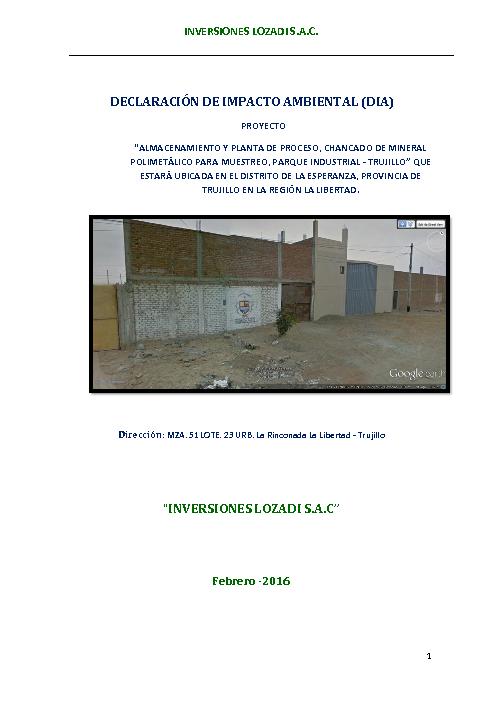 Declaración de Impacto Ambiental: Proyecto “Almacenamiento y Planta de Proceso, Chancado de Mineral Polimetálico para Muestreo, Parque Industrial - Trujillo”, Distrito de La Esperanza, Provincia de Trujillo, Región La Libertad