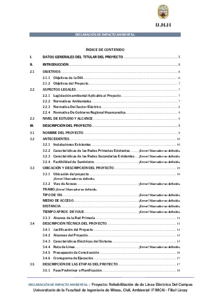 DECLARACIÓN DE IMPACTO AMBIENTAL: PROYECTO: REHABILITACIÓN DE LA LÍNEA ELÉCTRICA DEL CAMPUS UNIVERSITARIO DE LA FACULTAD DE INGENIERÍA DE MINAS, CIVIL, AMBIENTAL (FIMCA)- FILIAL LIRCAY