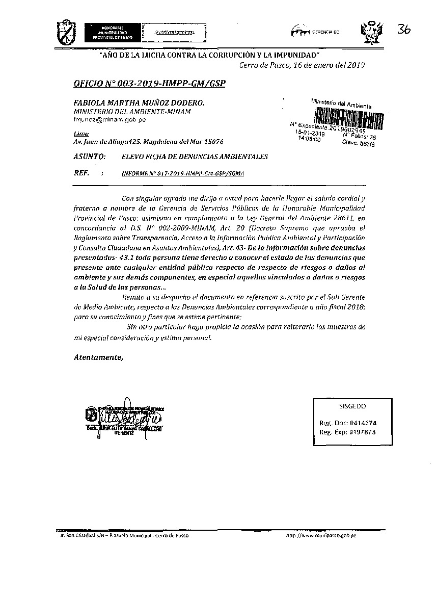 En cumplimiento de la Ley N° 28611 Art. 43, Inc. 43.1, que indica que "Las entidades públicas deberán enviar anualmente un listado con las denuncias recibidas y soluciones alcanzadas, con la finalidad de hacer pública esta información a la población a través del SINIA".