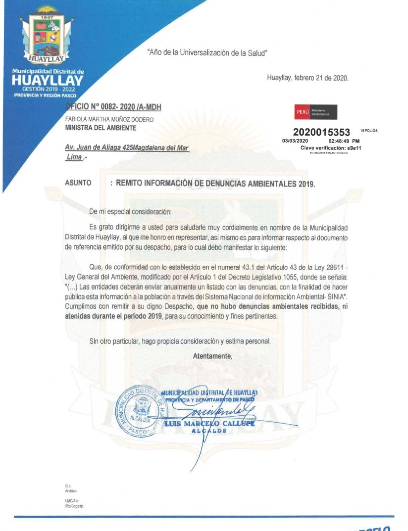 Denuncias ambientales 2019 Municipalidad Distrital de Huayllay