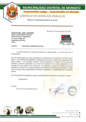 Denuncias ambientales 2019 Municipalidad Distrital de Monsefú
