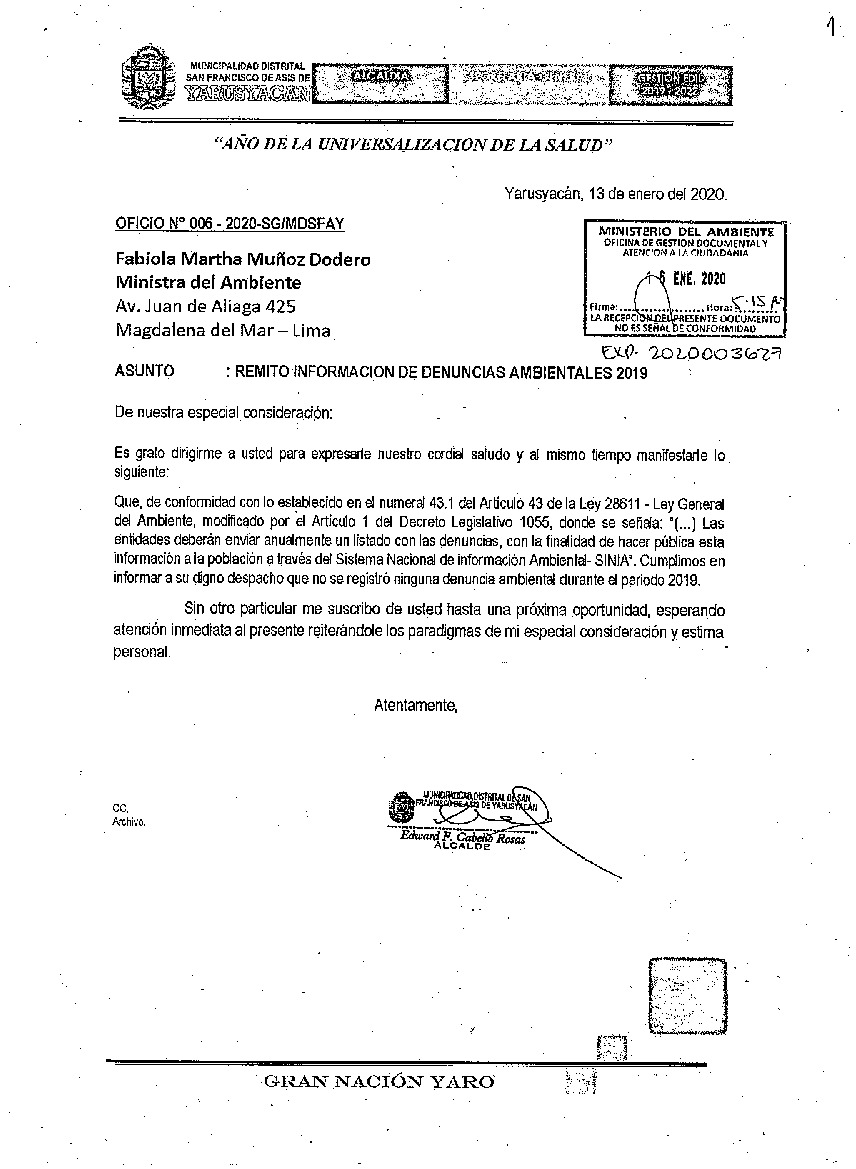 Denuncias ambientales 2019 Municipalidad Distrital de San Francisco de Asis de Yarusyacan