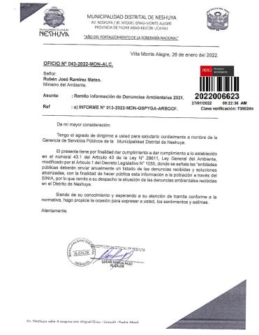 Denuncias ambientales 2021 Municipalidad Distrital de Neshuya