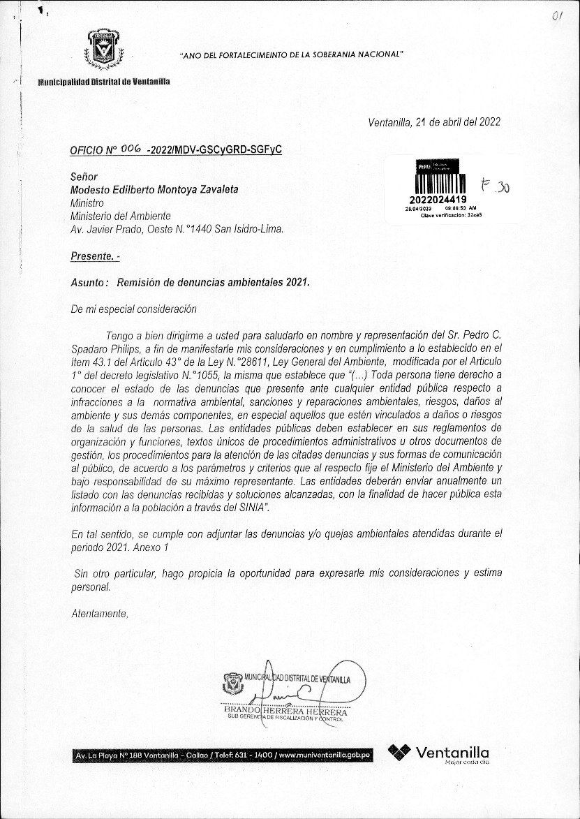 Denuncias ambientales 2021 de la Municipalidad Distrital de Ventanilla