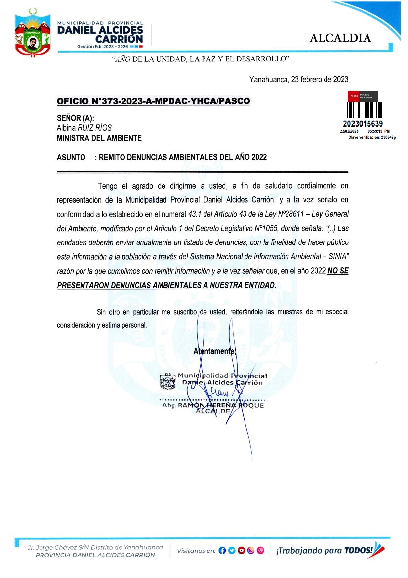 Denuncias ambientales del año 2022 de la Municipalidad Provincial Daniel Alcides Carrión