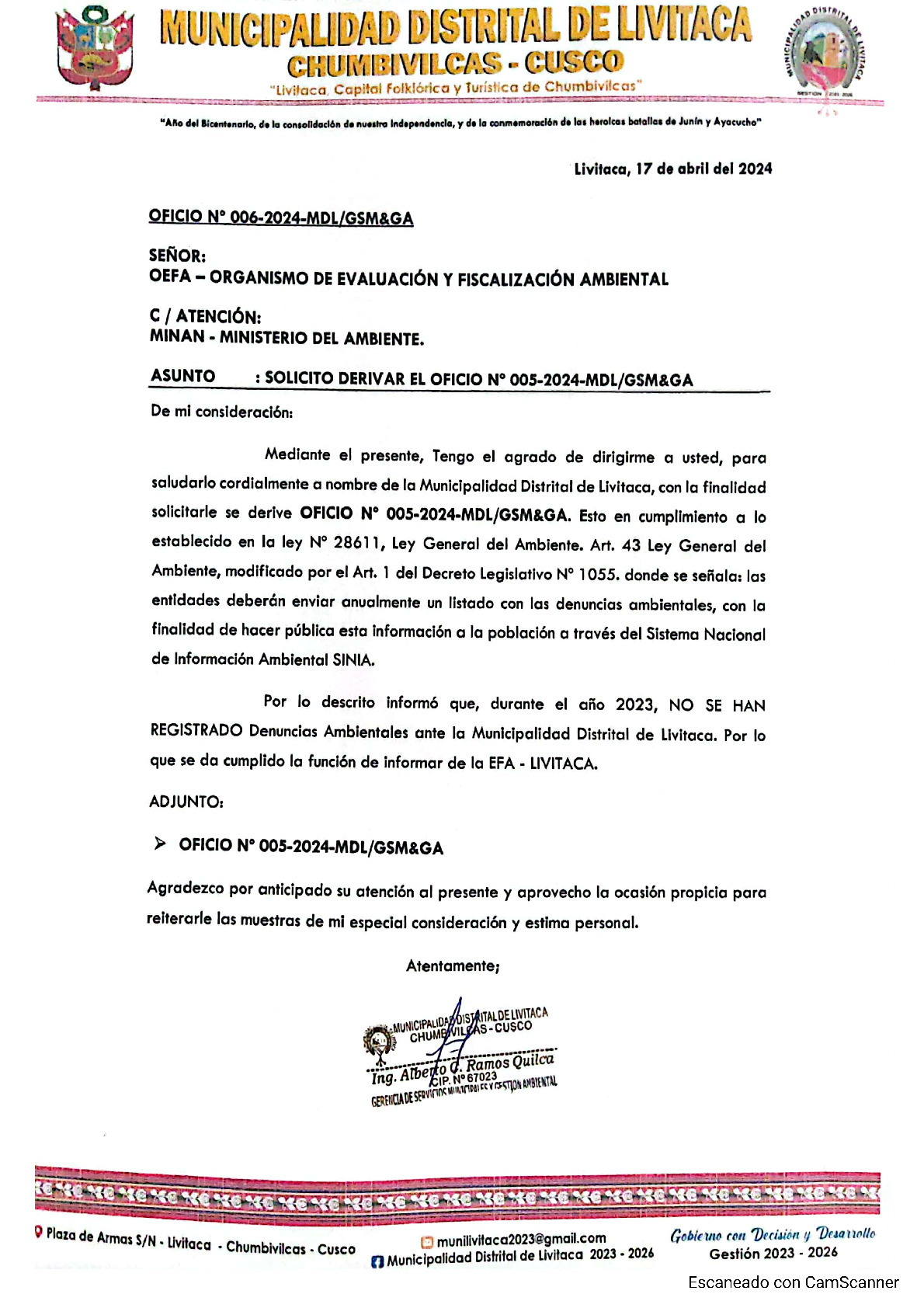 Denuncias ambientales del año 2023 de la Municipalidad Distrital de Livitaca - Cusco