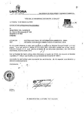 Denuncias ambientales atendidas 2019 Municipalidad Distrital La Victoria