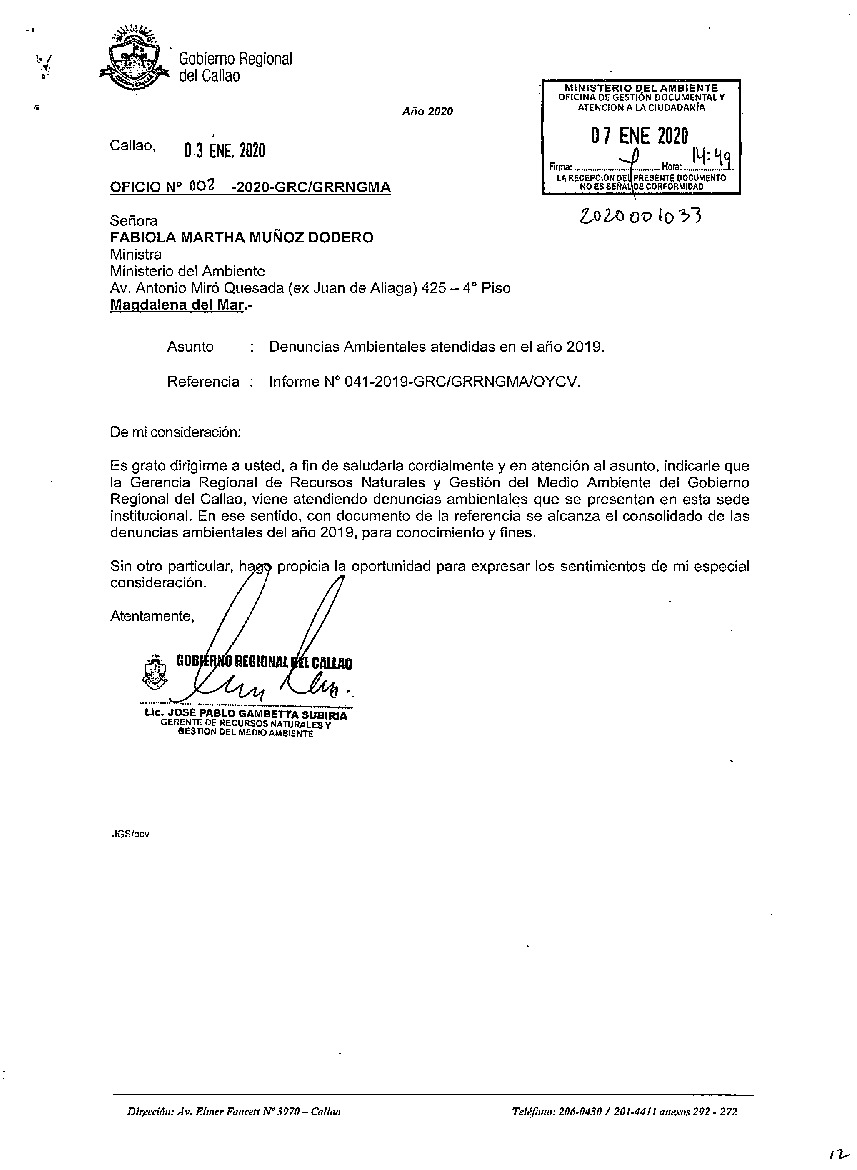 Denuncias Ambientales atendidas en el año 2019. Gobierno Regional del Callao