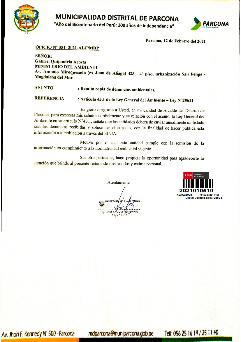 Denuncias ambientales correspondientes al año 2020 de la Municipalidad Distrital de Parcona