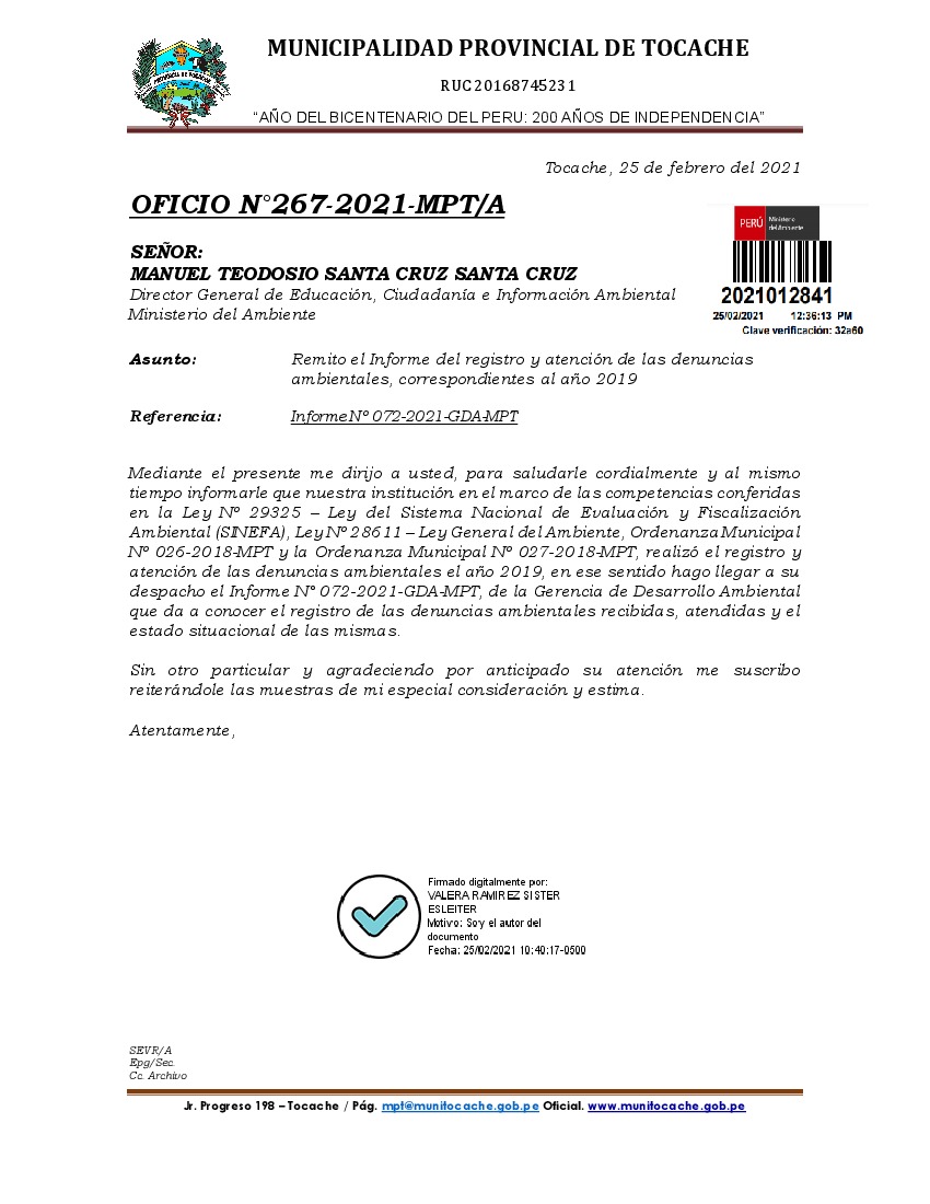 Denuncias ambientales correspondientes al año 2020 de la Municipalidad Provincial de Tocache