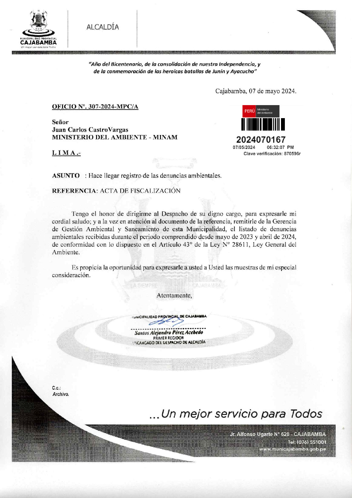 Denuncias ambientales de la Municipalidad Provincial de Cajabamba - Cajamarca del año 2023 - 2024