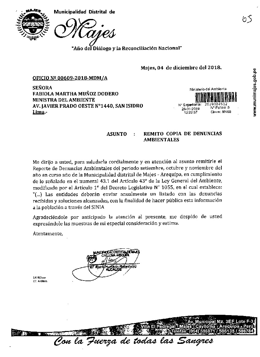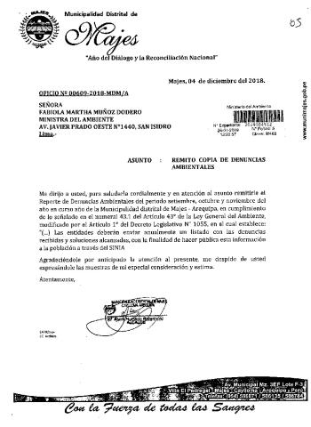 Denuncias Ambientales del período setiembre, octubre y noviembre del año 2018 de la Municipalidad distrital de Majes - Arequipa