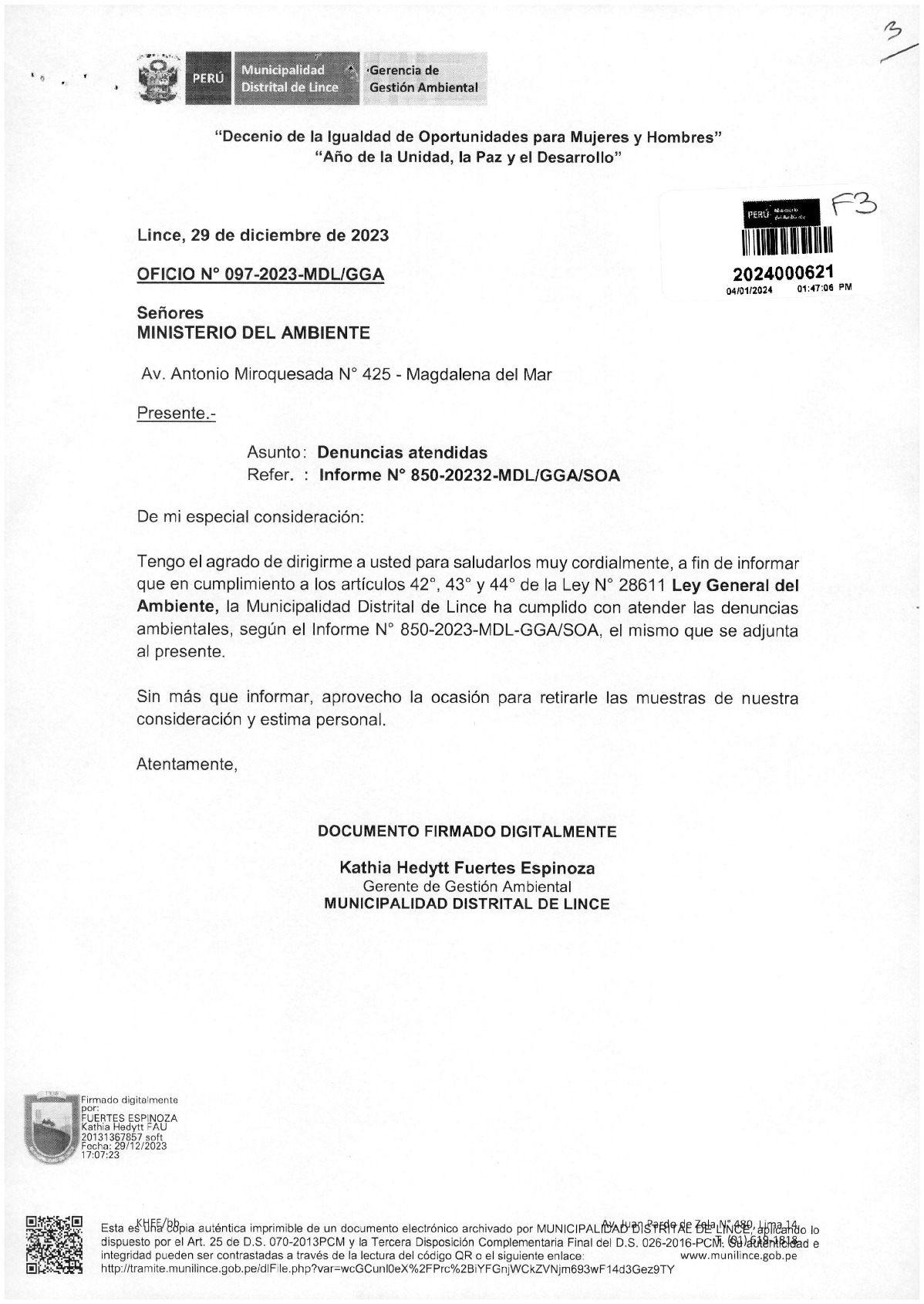 La entidad remite al Ministerio del Ambiente información sobre las denuncias ambientales en cumplimiento de lo establecido en el Decreto Legislativo N° 1055 que modifica el artículo 43° de la Ley N° 28611, que indica que "Las entidades deberán enviar anualmente un listado con las denuncias recibidas y soluciones alcanzadas, con la finalidad de hacer pública esta información a la