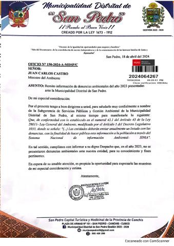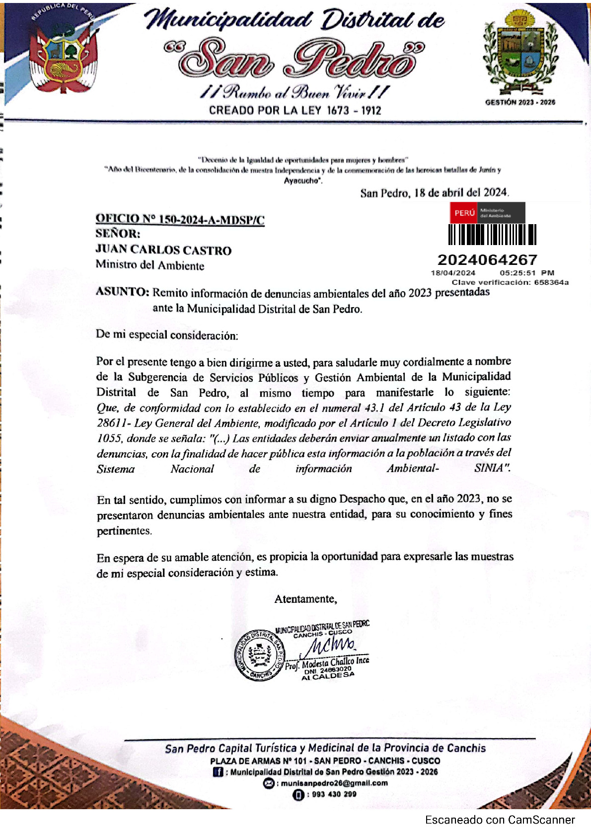 En cumplimiento de lo establecido en el Decreto Legislativo N° 1055 que modifica el artículo 43° de la Ley N° 28611, que indica que "Las entidades deberán enviar anualmente un listado con las denuncias recibidas y soluciones alcanzadas, con la finalidad de hacer pública esta información a la población a través del SINIA".